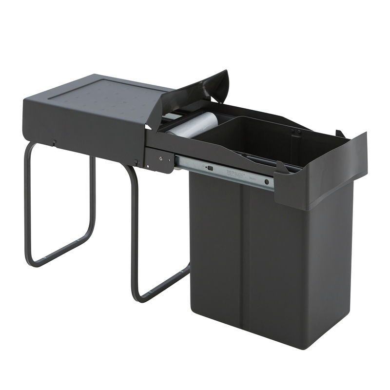 Ausziehbarer Einbauabfallsammler mit einem 21 Liter Kunststoff-Einsatz und einer praktischen Ablageschale. Der Einbauabfallsammler ist platzsparend und kann im Küchen-Unterschrank problemlos montiert werden.