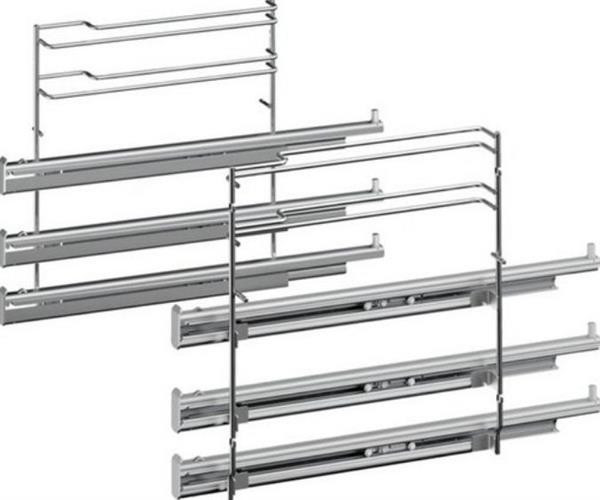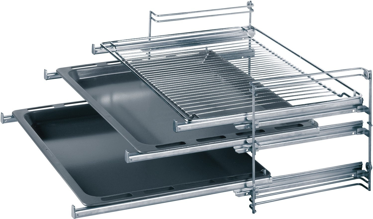 Dank 3fach-Teleskop-Auszug können Backbleche, Roste oder die Universalpfanne auf drei Ebenen aus dem Backofen gezogen werden. Ohne Kippen, weil die Auszugsvorrichtung stabil und sicher in die Backofenwand eingesteckt wird. Backbleche, Roste und Universalpfannen, die als Inklusivzubehör mit Backöfen und Herden ausgeliefert werden, können Sie in allen Auszügen nutzen.