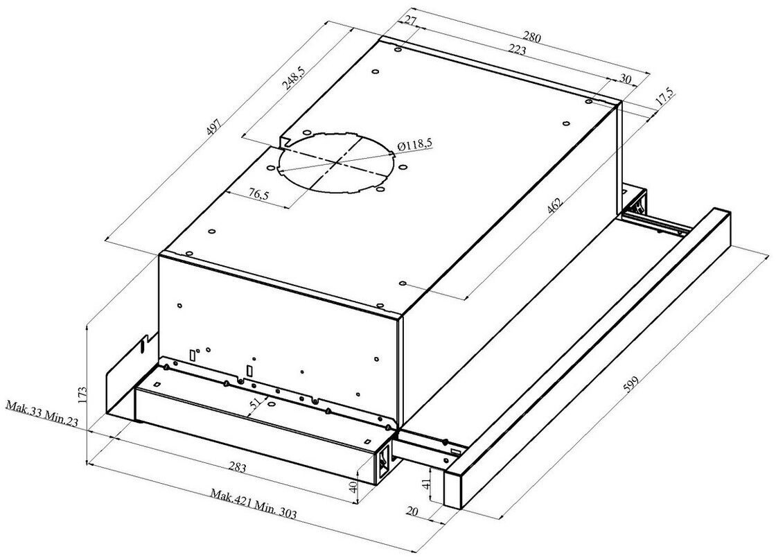 Gerätemaß (HxBxT): 174,0- x 600 x 310 mm