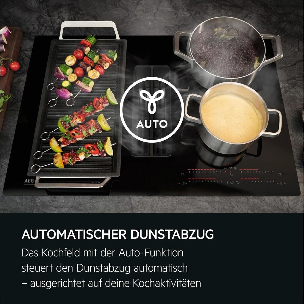 AEG 6000 Bridge XTM Induktionskochfelder mit integriertem Dunstabzug Die 6000 Bridge XTM Kochfelder haben einen leistungsstarken integrierten Dunstabzug und ermöglichen den Einbau in einen 60 cm Küchenschrank. Zudem bieten sie mit der Bridge-Funktion die Möglichkeit zwei Kochzonen zu einer großen zu verbinden, sodass auch großes Kochgeschirr optimal erhitzt wird.