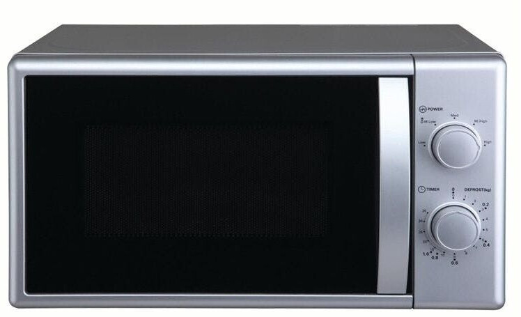 Silber lackiert, Garraum lackierter Stahl, 20 Liter Volumen, 700 Watt Maximale Leistung, 5 Leistungsstufen, Auftaufunktion, Endsignal, externer Griff, Drehteller 255 mm