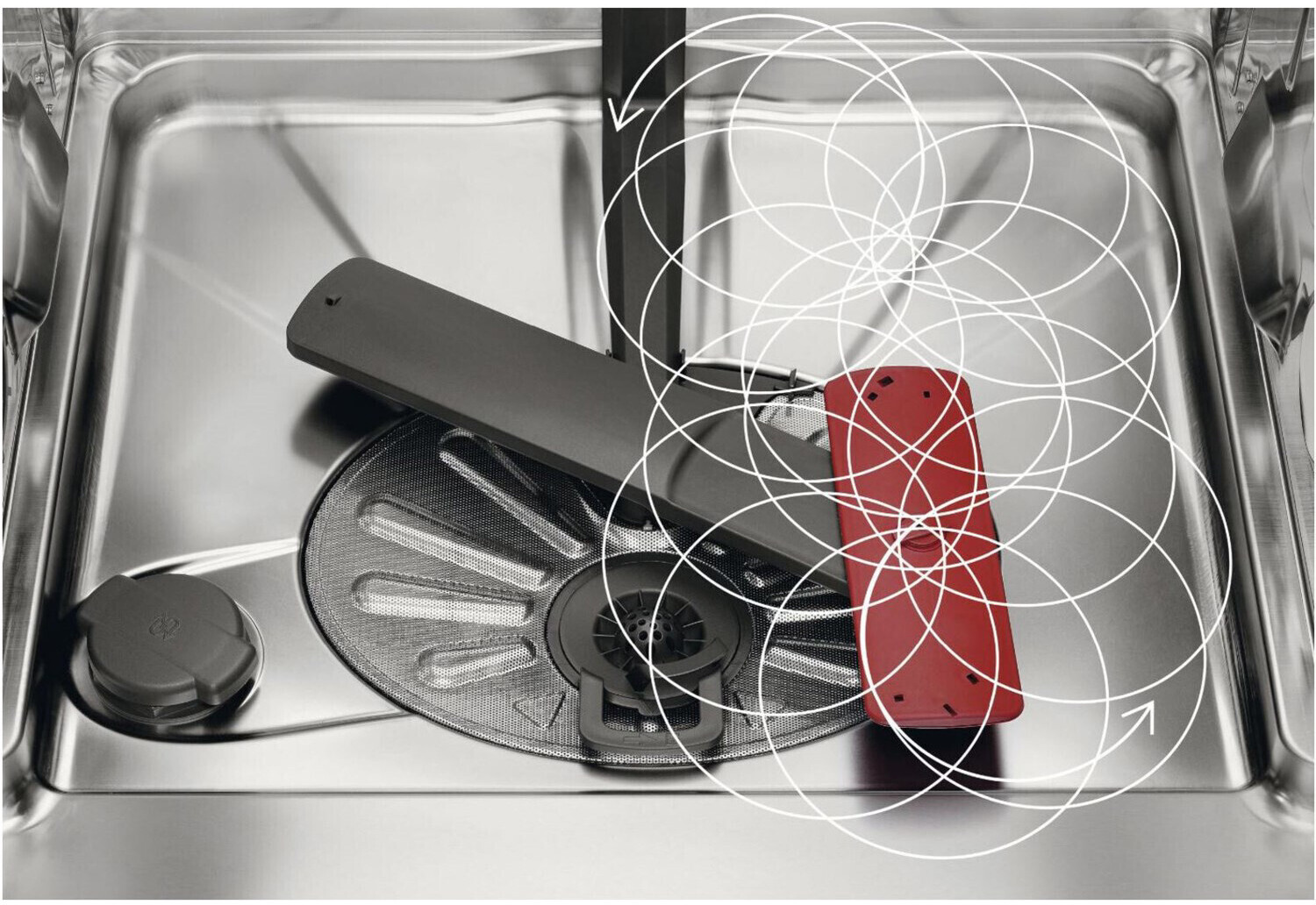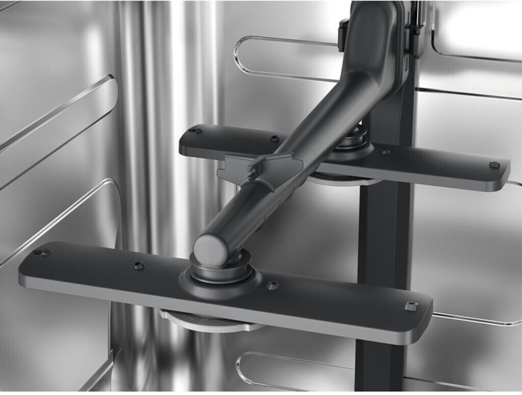 Der Sprüharm mit Doppelrotation bietet eine bis zu dreimal bessere Sprühabdeckung. Die feine Verteilung des Sprühwassers erreicht jeden Winkel. Hartnäckige Verschmutzungen werden leichter gelöst und gleichzeitig wird Wasser gespart.