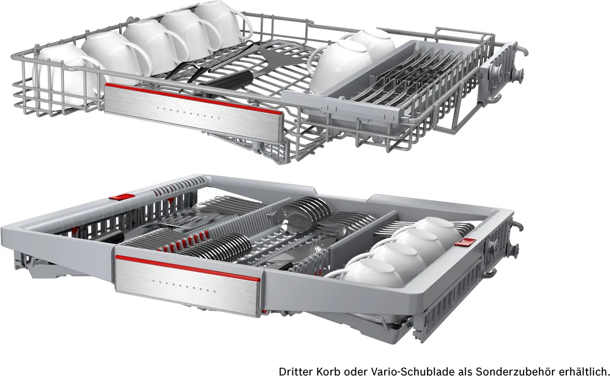 Der Oberkorb ist durch die 3-fach Rackmatik mit einem Griff um insgesamt 5 cm dreistufig höhenverstellbar. Und das sogar voll beladen. Ob Pizzateller oder langstielige Gläser - für hohes Spülgut wird so ganz flexibel oben oder unten noch mehr Platz geschaffen.